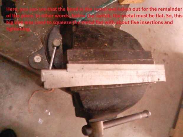 Más allá del interruptor no es necesario para el metal de hoja con una curva, por lo que con unas bielas en el vicio, el metal fue aplanado. Esto implicó insertar el metal, arranque duro, quitar y volver a insertar y repita hasta plana en toda la longitud prevista.