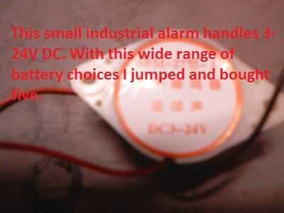 Esta alarma era muy barato y versátil (debajo de 50 centavos en el mercado de la electrónica). Además, tiene un cuerpo de plástico duro con los tornillos de montaje y tiene dos cables que salen (precableado). La variación en el voltaje de entrada 3-24 voltios significa que podría utilizar casi cualquier tipo de colocación alrededor de la batería. La función de precableado significó que no necesita soldar (ahorro de tiempo). Los tornillos de montaje significan que ya tenía un recinto que se podía montar y no necesito hacer uno. Cinco, tengo necesidad de dos.