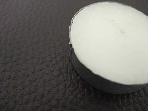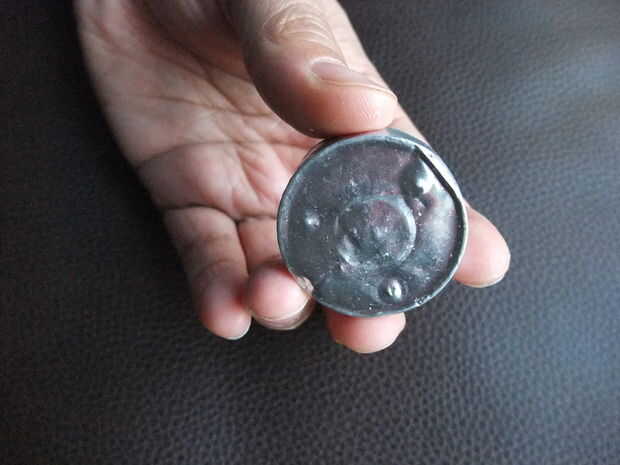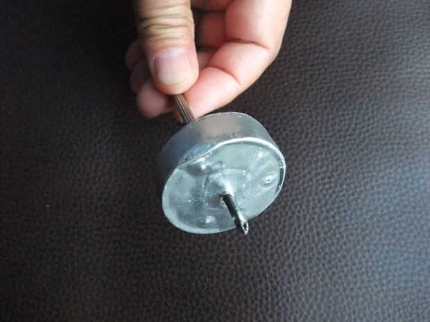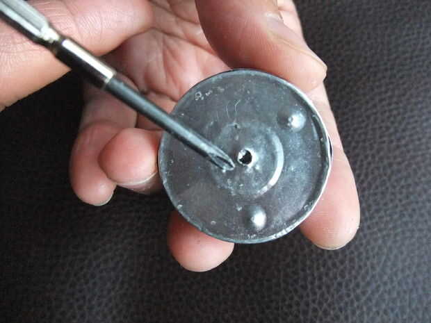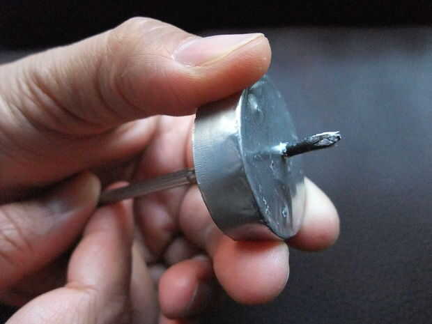 -Usando el agujero en la cera como la guía, hacer un agujero en el centro de esta bandeja con el destornillador