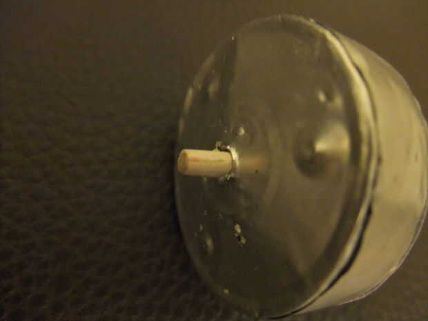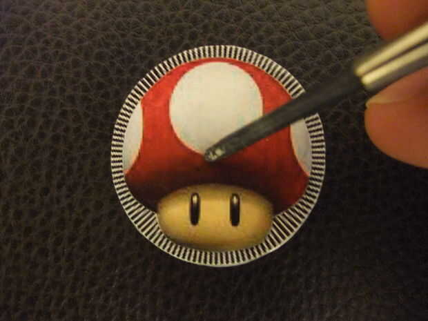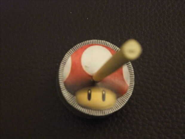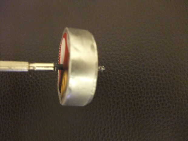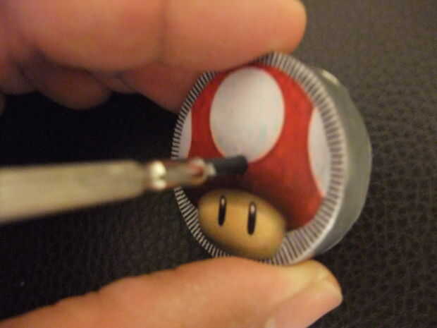 -Utilizando el destornillador, hacer un agujero en el centro de la etiqueta [puesto que la rueda ya tiene un agujero esto debería ser fácil]