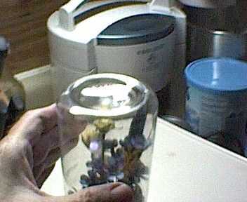 junté cuatro pilas tipo LR44 y un transistor de efecto de campo con un cable corto en su puerta, por lo que cualquier movimiento en el fallo que ocasionará que a la luz. Frascos de vidrio no se sostendría una carga para mí, así que usé un tarro plástico de mantequilla de maní. Deje que el plomo de la puerta de la FET sólo cuelgue allí. En un día muy seco sólo se puede caminar por la luciérnaga y parpadeará en usted!