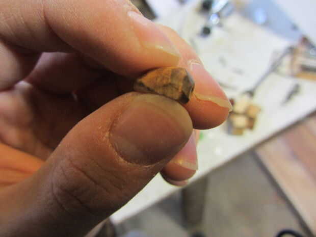 Ahora las cosas se ponen más difícil. Sierra o cortar el final o la madera que fueron trabajando para que se quede con una pieza en forma de bala de madera ~1/2 "largo (mientras su diámetro). Luego, continúan los bordes en la parte recién cortada de la arena hasta llegar a una esfera rugosa. La madera es muy pequeña en este momento, puede ser más fácil agarrar la madera con pinzas en una mano, ya que dan un agarre firme sin ocupar tanto espacio como los dedos.