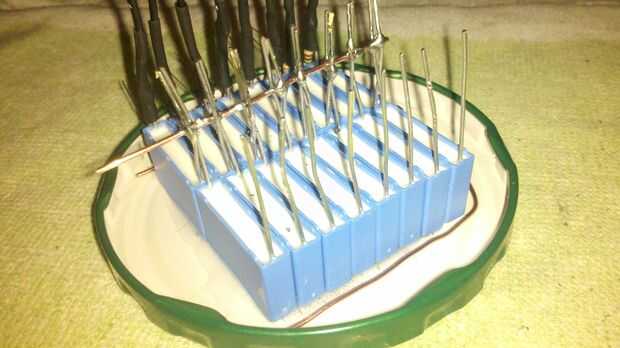 El primer paso es montar los condensadores a la tapa de la jarra. Yo escogí un frasco con un trazador de líneas/sello de plástico rociado en. No era realmente necesario, pero quería evitar la posibilidad de un corto circuito. Los condensadores que tenía eran rectangulares, pero también vienen como paquetes de barril. No importa lo que son lo son no polarizados 1uF casquillos. Pegamento a la tapa. Se desea formar las patas de un lado de los condensadores, se trata de su "tierra". He soldado las patas para un trozo de cable pelado y luego cortar el exceso de la pierna,