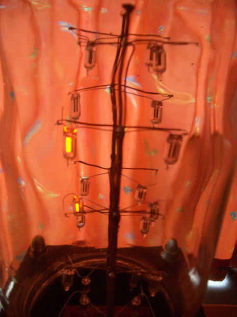 Usé el mismo circuito 20 veces y cableados junto con algunos materiales steampunkisch como un medidor de vintage, baquelita cambia, algunos latón y cera teñidos de MDF.