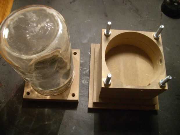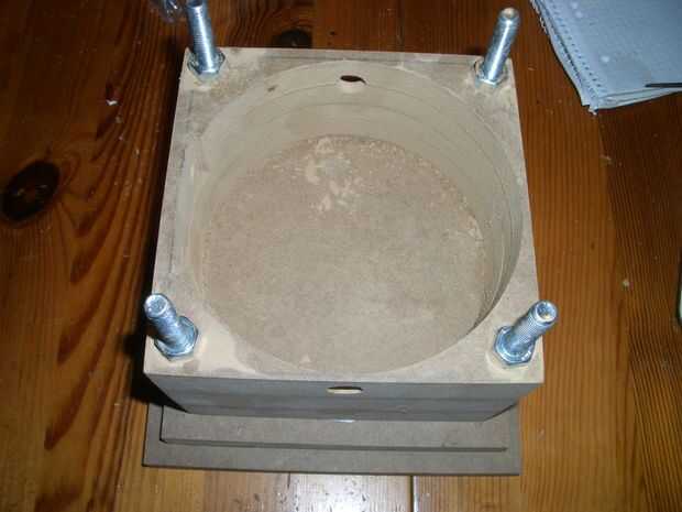 El caso fue hecho del MDF. Puedes ver los dos orificios de los interruptores. Los cuatro tornillos son para el montaje de la placa superior y la jarra. Todo lo encajadas entre sí y lo lijado todo y manchada con la mancha de cera.
