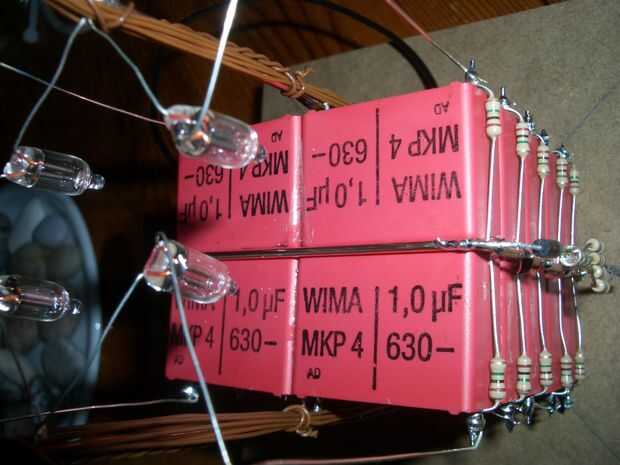 Delgado Teflon aislado los cables que utiliza para la conexión entre los bulbos y los condensadores.
