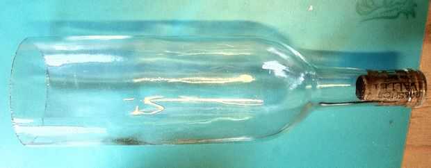 Beber el vino. Vuelva a colocar el corcho en la botella. Envuelve la base de la botella con una banda de cinta adhesiva para apoyar el vidrio durante el corte y reducir la cantidad de saltar etc.. El corte se fue muy rápido y deja un acabado bastante bonito. Puesto que el extremo cortado se incrustará en masilla de silicona no me molesto intentar conseguir liso.