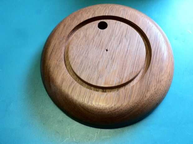 Afortunadamente mi amigo Slittape tiene un torno para madera y es un excelente trabajador de la madera. Después de cierta discusión utiliza un trozo de caoba para terrazas y vuelta a unos 5" diámetro. Luego redondea el borde. Medimos el diámetro de la botella de vino de corte y corte una ranura en la superficie superior para que coincida con. Por último él utiliza su taladro para cortar un agujero para la línea de entrar desde el lado y la parte superior. Luego alisa todo con papel de lija y había acabado con dos capas de cera de la carnicería. Como se puede ver que salió muy bien.