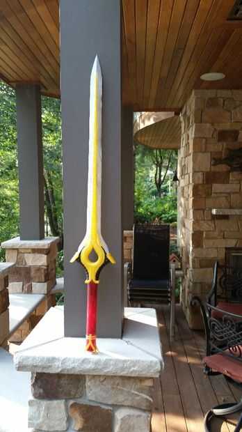 Para imprimir la espada, cortar el diseño por la mitad (plano horizontal) y luego en 3 pedazos partidos ya que es una espada de 40" y tengo una cama de 16" de ancho. En la interfaz entre los segmentos, hice rodajas de V a la stl para que cuando vaya a soldar y soldadas las piezas PLA juntos, tengan más fuerza. Esto funcionó bien para mi espada Ike que imprimí en una manera similar. La espada entera tomó 2 días para imprimir (varias piezas a lo largo, así que algún tiempo muerto) y es aproximadamente 650g en material.