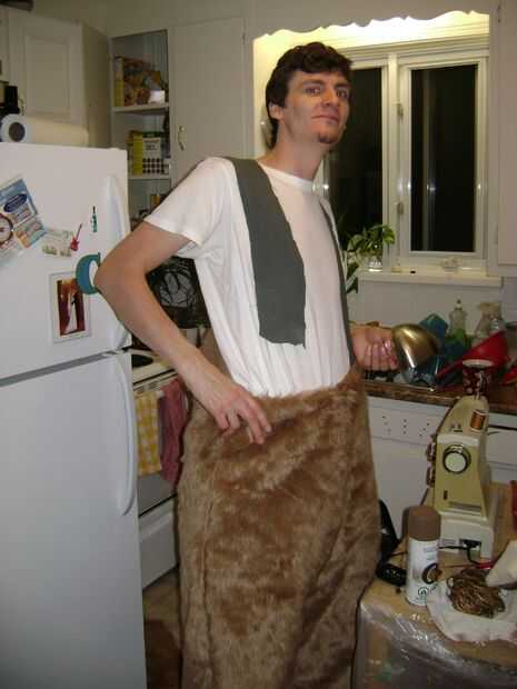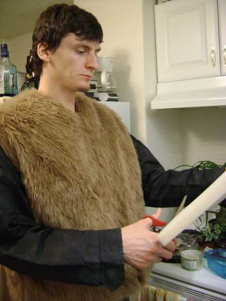 Para la parte superior del cuerpo, utiliza una chaqueta vieja como la base y cubierto de diversión piel. Antes de coser las mangas nos rellenó los hombros con cuñas de espuma de tapicería.