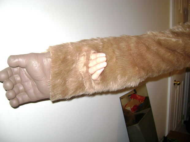 Hacer las mangas extras largo para dar cabida a las extensiones de brazo y corte ranuras así que él puede conseguir sus manos real hacia fuera cuando necesita hacer una cerveza.