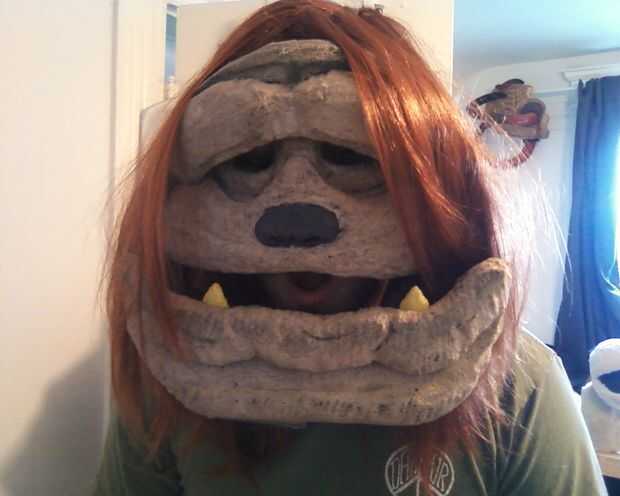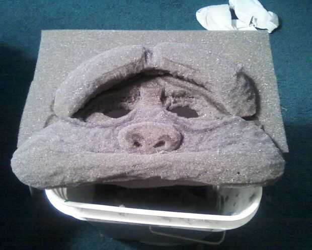 Tomé 3 hojas de 1" espesor espuma y capas con pegamento GEL (Gel es óptimo para pegar espuma juntos porque el pegamento Regular se filtra a través y consigue todo los dedos). Después de me visualiza la profundidad de la cara de Ludos junto con sus características y comencé a talla, a partir de los orificios de los ojos ya que son más importantes en una máscara. Los cuernos que hice de una dona flor de espuma de poliestireno, cortar y volver a pegar en los ángulos para llegar a la curvatura correcta, les pegan a los lados de la máscara. Yo también les reforzado con tiras de espuma de fo para superficie de pegamento extra. Hice las orejas de las tiras de espuma pellizcado en el lóbulo y pegado a la parte inferior del cuerno.