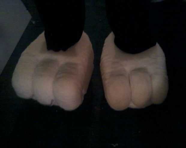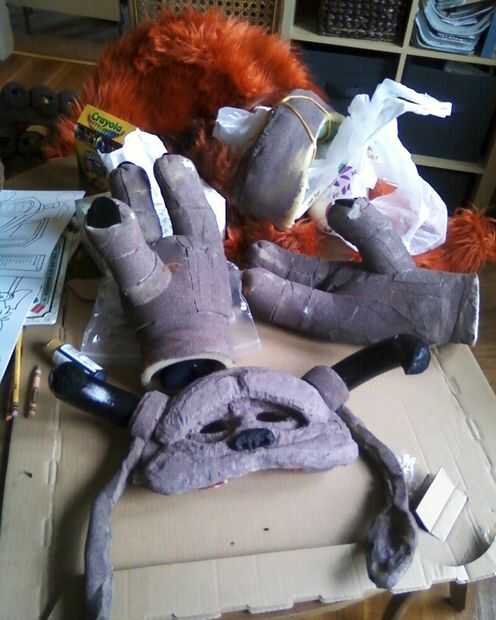 Me tomó a un par de guantes de invierno y pegan los dedos en sets de 2. Luego envuelve en 1/2" espesor de espuma plegable, redondeo, cortando y pegando hasta que estaban totalmente cubiertos. Me extendido y había acentuado los dedos por cortar los dedos de espuma y re pegado en secciones más pequeñas, creando los looks de las articulaciones. topping con una uñas plástico hecho de desecho plástico y pintura.