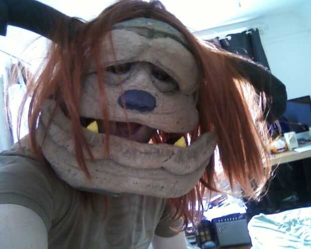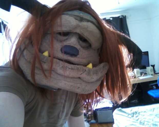 Y acerca de él. Ponérselo puede ser un poco de un desafío en mi propia, sin "Ludo de equipo" (mi hermana Jemma, mi hermosa señora y yo). Primero los pantalones y el torso, los pies siguiente, luego la barbilla, máscara, peluca y finalmente las manos.