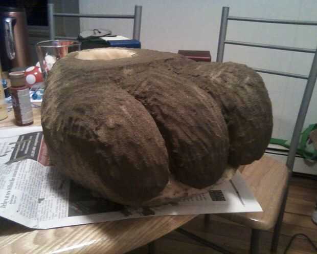 Me llevó a grandes bloques de espuma de unos 8" al 10" por 14" y los hueco de la parte inferior hasta la forma de mis zapatos que planeaba usar, haciendo un gran agujero en la parte superior para encajar mi tobillo superior. En el exterior cortada y tallada lejos les redondeo los bordes y luego esculpir los pies utiliza el mismo repuesto plástico para hacer uñas de los pies.