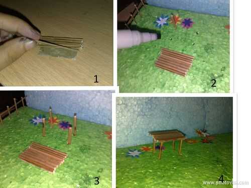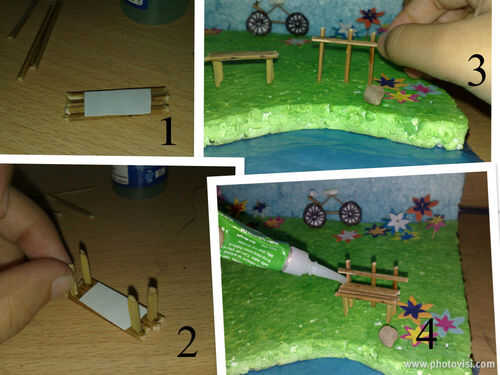 Utiliza pequeños palos para hacer el Banco y el lugar con una escalera colgante.