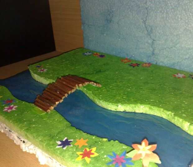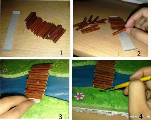 Utilizar los palillos pequeños de madera y papel grueso para hacer el puente. Asegúrese que el ancho del papel es 1cm menos que la longitud de los palos y la longitud de los papeles es de 3-4cm más que el ancho de los ríos (de modo que usted puede doblarla). Pega todos los palos en el papel y coloque el puente sobre el río, como se muestra en la imagen.