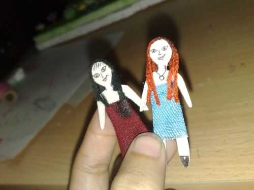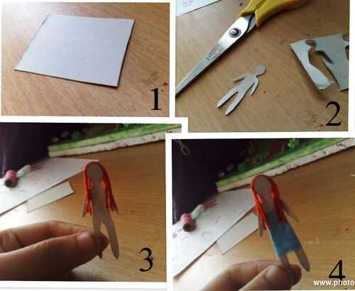Use papel grueso para que la gente pequeña. Corte en cualquier forma que usted quiere, pega el hilo alrededor de la cabeza como pelo, dibuja la cara (dibujar una cara feliz! :)) y poner algo de ropa en...
