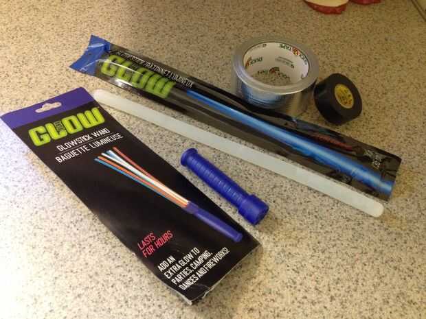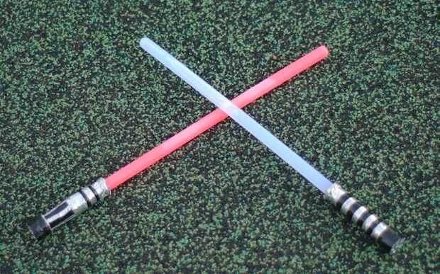 Los sables de luz eran probablemente nuestro hallazgo más emocionante.  Nuestros muchachos son uno y dos años de edad, y son pequeños para su edad así.  Los juguetes comprados en tiendas encontramos eran demasiado grandes para ellos todo camino.  En el árbol del dólar llevaron gran resplandor palos y mangos que se venden por separado (previamente empaquetado con muchos más pequeño resplandor palos a palo en el mango).  Mi marido estaba convencido de que los palos grande cabrían en el mango, así que decidimos comprar las cosas y darle una oportunidad.  Eureka!   Ajuste perfecto!  Hizo los mangos ves fresco con alguna cinta aislante negra y plata cinta pato.  Los palillos del resplandor parecían que duraría para siempre.  Congelarlas y volver a utilizar.