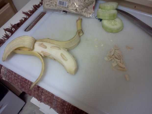 El primer paso es pelar el plátano y empuje el relleno en la carne de la fruta. Y eso es todo. Puede ser sin embargo creativo como el gobierno le permite estar en este paso, añadir cosas como chispitas y qué no, otras cosas no saludables deliciosos que harán de este tratan que mucho más deseable.