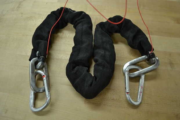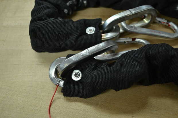 16. una vez que todo lo que está listo para funcionar, ejecutar un alambre flexible de los extremos de los eslabones de la cadena que conecta ambos extremos de la cadena. Utilice cinta aislante para fijar el cable.