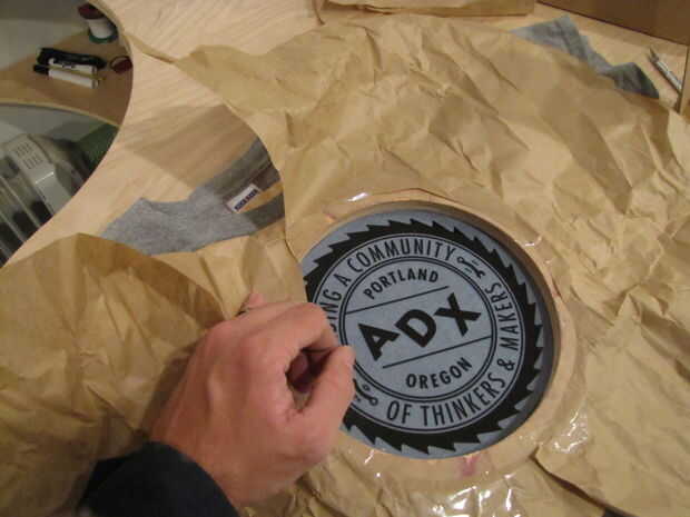 Ahora, puse el logo en su enmascarada de marco en la camisa, asegurándose de que ninguno de ellos tenía cualquier arruga.  Considerado el uso de una pinza o dos para mantenerlo, pero se olvidó de agarrarlos antes de salir.