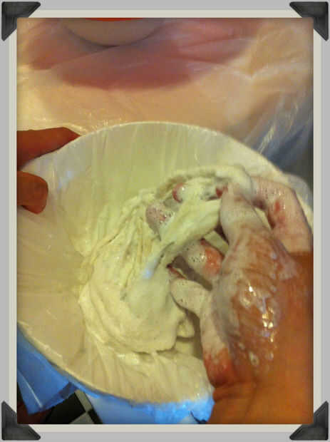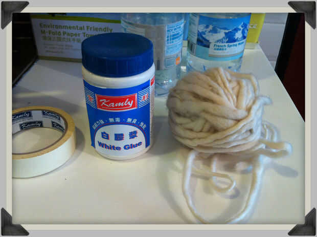 Teniendo la lana como una pelota, exprime la mezcla de pegamento a través de él que estaba empapado completamente. Mantener una bola significa que yo puedo desentrañarlo más fácil después.