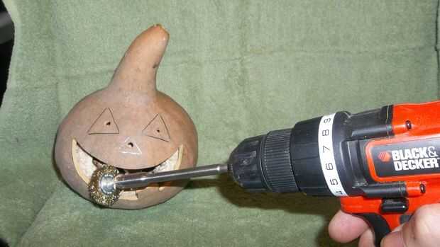 Esta es el menos parte del proyecto de la diversión. Utilizar un cepillo de alambre en una extensión de poco y mi taladro. Puede utilizar cualquier número de otros métodos para elaborar la pulpa interior. Hacerlo con cuidado, es fácil romper una calabaza en esta etapa. Sólo la boca de corte disminuye la posibilidad de que esto ocurra.