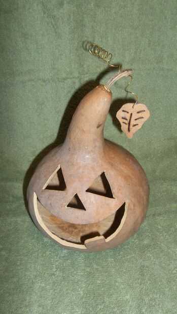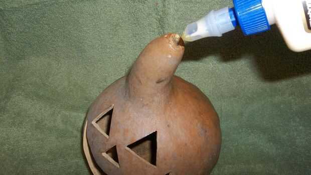 Si tu calabaza todavía tiene su vástago conectado, bueno y bueno. Si se ha aflojado o está faltando en conjunto, taladre un orificio en la punta. Utilice woodglue para volver a colocar el vástago. Si falta la madre, se sustituye un pequeño trozo de rama de árbol o la espiga. Perfore un agujero pequeño a través del tallo y la hoja. Espirales de una longitud de alambre de abalorios alrededor de un lápiz y usarlo para conectar la hoja y calabaza!