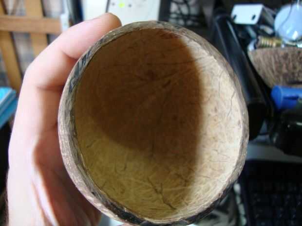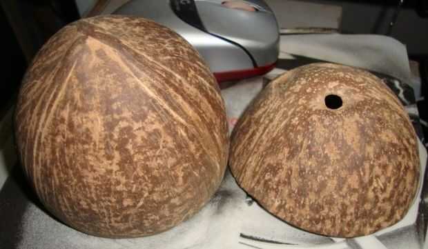 Primeiramente vem una matéria prima para o projeto: o côco! UE o abri com uma serra e lixei sua superfície até sacar bem liso ao toque.