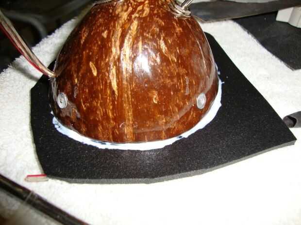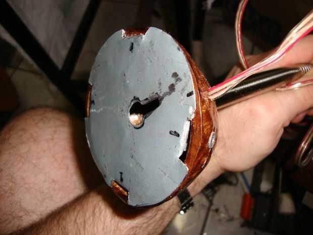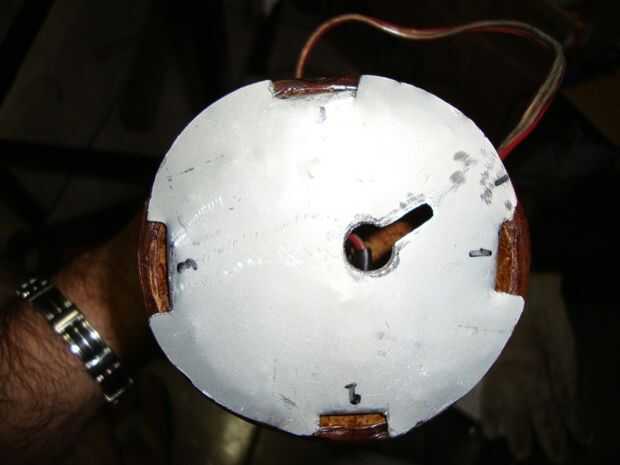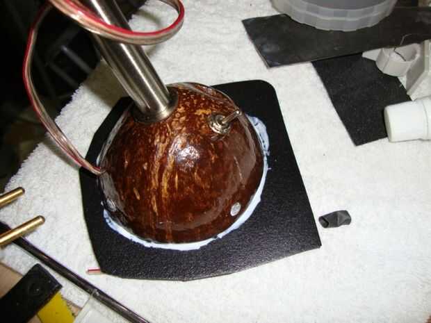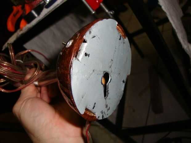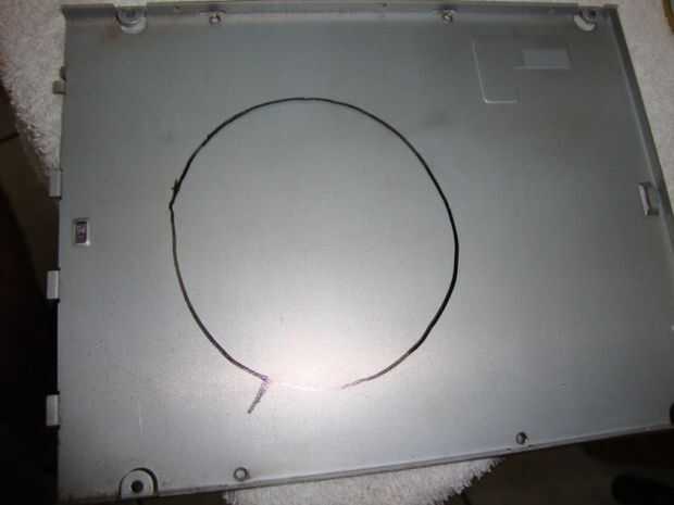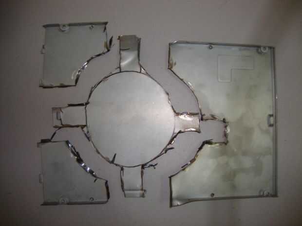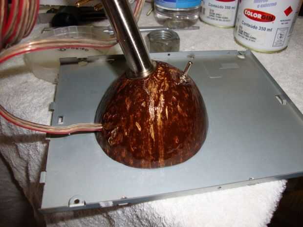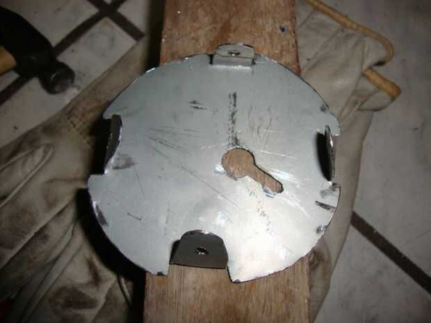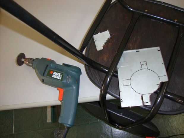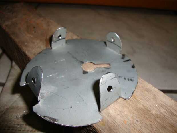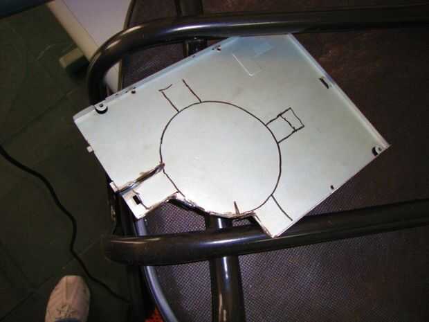 Para la base usé el metal desde un CD-ROM estropeado. Retirar la placa de medición y hace los cortes con el taladro. También hice un agujero de perno para el montaje en la pared. Por último, pegué una goma en la parte inferior.