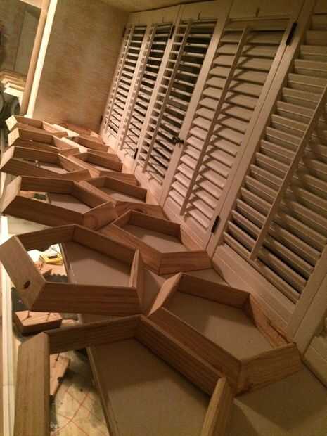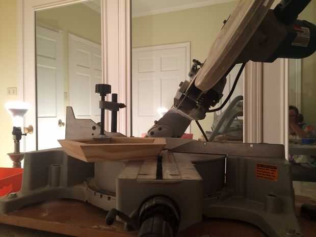 El último corte para el dodecaedro es el ángulo diedro. Este es el ángulo que une un plano a otro, y de un dodecaedro, el ángulo es 116,6 grados. Para cortar este ángulo reste 90 (lo que una hoja se encuentra en) y obtener grados 26,6. Usé una tronzadora para cortar este ángulo, pero altamente sugieren una tabla vio, ya que es más seguro y tiene menor posibilidad de romper los pentágonos. El inglete se encuentra a 54 grados para alinear correctamente la cuchilla con el lado del Pentágono. Comencé la hoja en la parte superior y cortar. Después de 60 cortes, tuve mi 12 pentágonos listos para encolar.