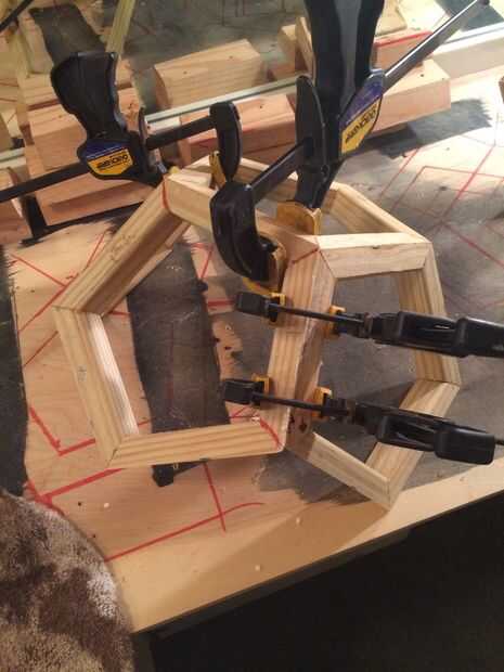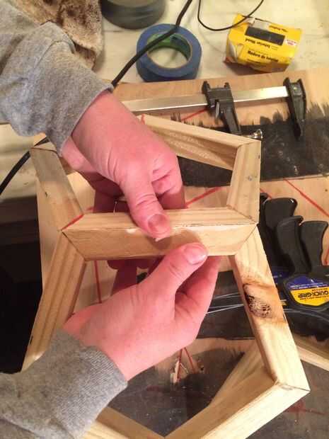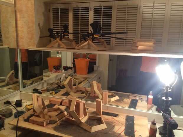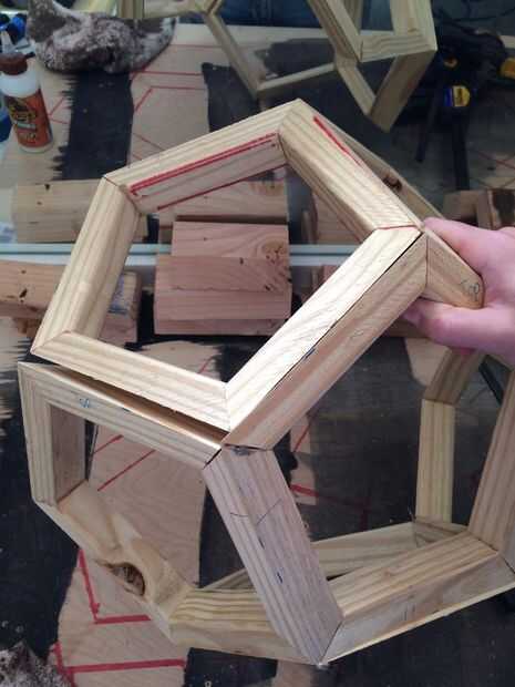 Como se puede ver en la última foto, la pareja del Pentágono no caben debido a las inexactitudes de mis cortes y VI. Para compensar esto, recut 10 8" piezas y usa la Sierra de mesa para afeitarlas abajo a 54 grados hasta que encajen las caras del dodecaedro donde iban a ser pegados.