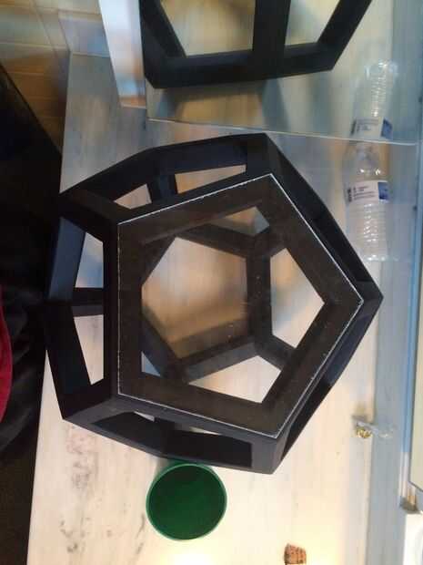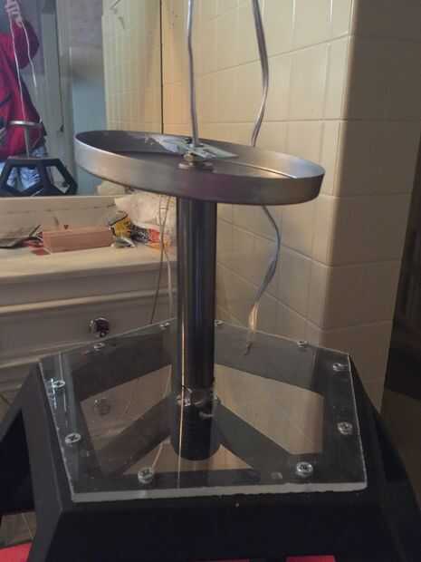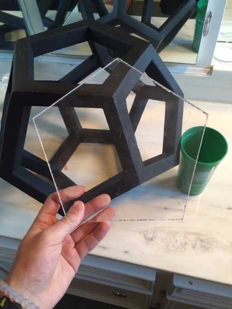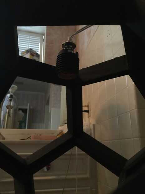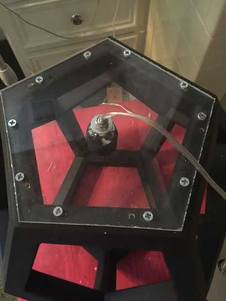Para montar la luz, tengo un 1/4" espesor pieza de plexiglás que era ligeramente más grande que un rostro de uno de los pentágonos y redujo a ser un poco más pequeño que un Pentágono. Taladraron previamente los agujeros para los tornillos y para el socket a, justo en el centro del vidrio. Atornillan abajo con los tornillos un poco cortos para no fui todo el camino a través la la madera. Utilicé un poco más grande para ampliar el conjunto y a continuación calar la simple toma de luz y el cable a través de ella para que la parte superior más pequeña de la toma (junto con una arandela para distribuir el peso) quepa suficiente para una tuerca de apriete hacia abajo desde el otro lado.