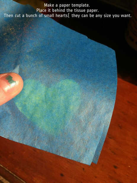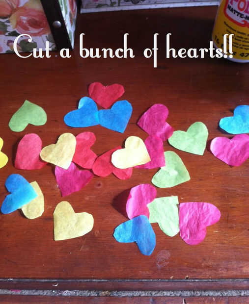 Cortar un montón de corazones hacia fuera con unas tijeras. Con la plantilla tras el papel de tejido:-D