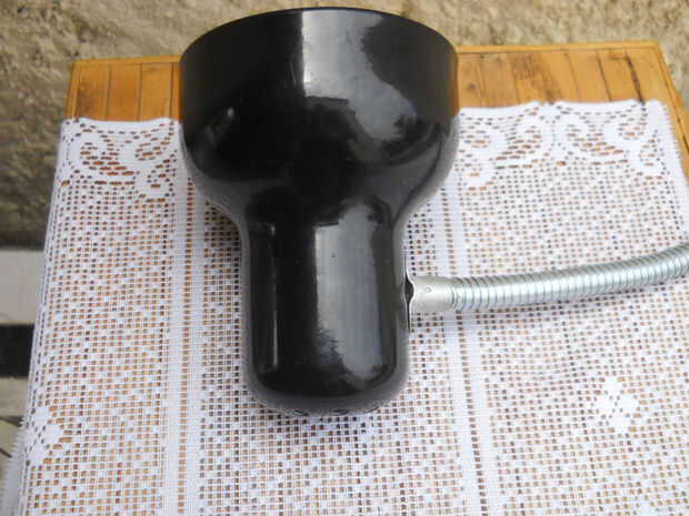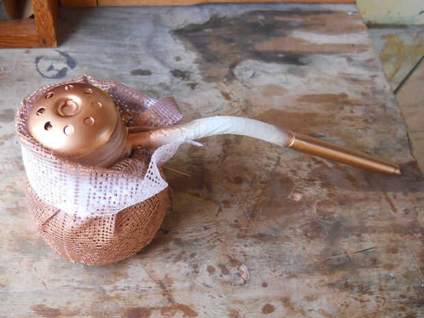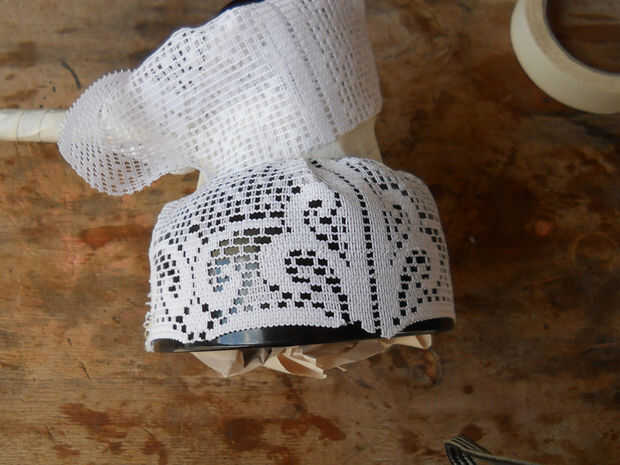 Con la sombra cubierta con encaje, rociar una capa de pintura metálica cobre... Deje secar y retire la cinta y encaje.
