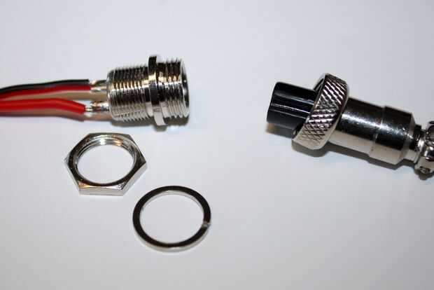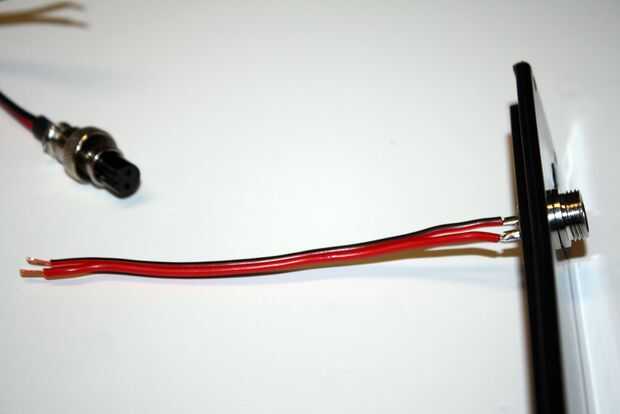 Un corto cable de 18 calibre en la parte de montaje de panel del conector, luego un segmento de alambre de 8 pies para el conector externo para conectar a la fuente de alimentación de la soldadura. Cada pin de este conector se denomina: "1" y "2" - en tanto el panel montaje lateral y el lado de montaje de cable. Asegúrese de seguir estas etiquetas (es decir, uso rojo positivo = 1 y negro negativo = 2) al soldar ambos conectores. Si no y pernos de Cruz, tienes un corto!