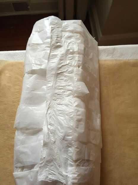 Tire el borde con cinta alrededor del borde untaped y presione juntos. Forma y formar la estructura de un tubo redondeado y parado. Si un poco tambaleante corta algunos de los tacos que no están revestidos de plástico. Encontré que corta fácilmente con tijeras de artesanía. Algunos de los adornos podrían soltarse. Simplemente cortarlos.