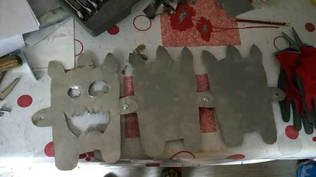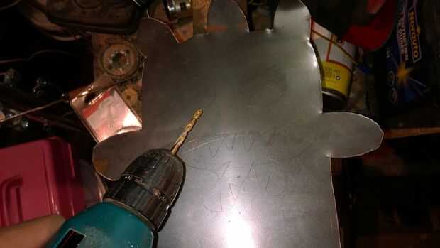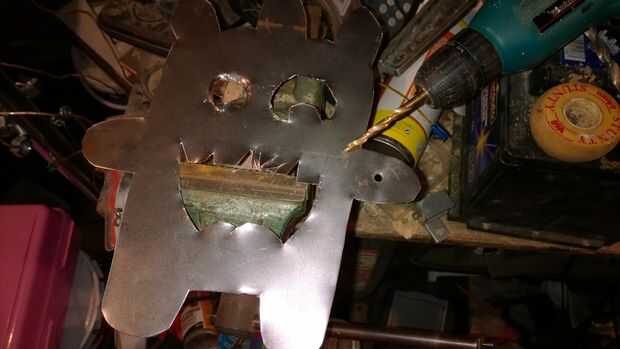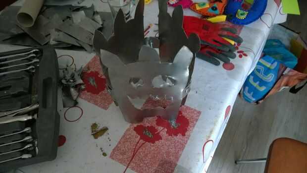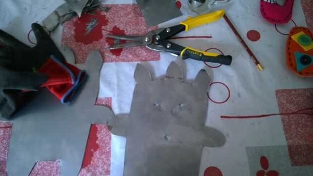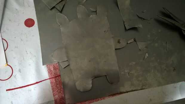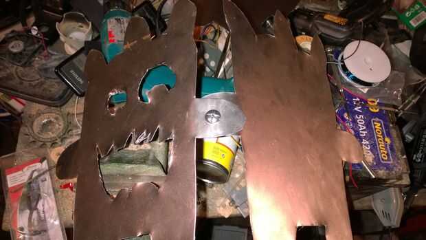 Entonces previamente pinchada la placa de metal para cortar los ojos y la boca.