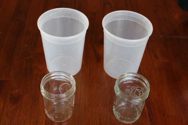 Usé un recipiente de plástico de tamaño (32oz) de cuarto de galón para el exterior. Una jarra una taza (8 onzas) se utilizó para el volumen ahuecado. Para evitar la rotura del vidrio durante el proceso de congelación, recomiendo usar envases de plástico para ambas piezas. Además de los contenedores, necesita algo (monedas, canicas, frijoles) pesan el recipiente interior y cinta.