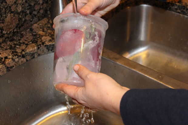 De nuevo, utilice agua caliente en el exterior del molde para romper la interfaz entre el hielo y el recipiente exterior. Cuidado con los lumiere en este punto, va a ser resbaladizo.