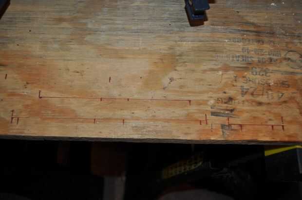 Marcaron en mi mesa de freno (una hoja de madera contrachapada sobre unos caballetes) los lugares donde necesitan curvas en las diferentes piezas de ancho, luego cuando fui a doblarlas, transfirió las marcas a la pieza. Fijar las piezas en el freno, prestando atención a cómo doblarlas por lo que podría caber bajo la sujeción de la curva siguiente, después de ser doblado. Luminario exterior requiere 4 curvas, una curva de 90deg de 1/4" en los bordes laterales y entonces la ~ 75deg ángulo dobla para obtener la forma trapezoidal. Hice en primer lugar, las curvas de 1/4" y una 75deg entonces doblar el otro para que el primer 75deg se dobla sobre la bodega abajo.