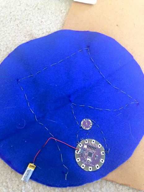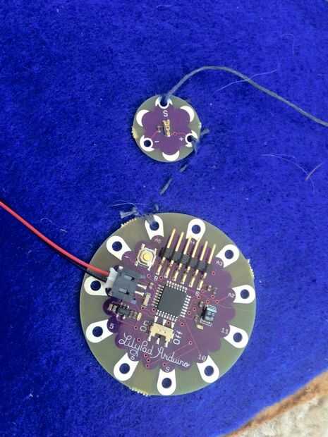 a. Nota: Asegúrese de que el interruptor de la placa base esté en OFF al coser tus circuitos. Esto asegurará que no hay ninguna energía de la batería mientras se cose. Si el poder no se apaga, tocar incidentales de los hilos de la – y + pétalos mientras que coser puede resultar en una pequeña chispa y algo de humo. Mientras que esta chispa no puede iniciar un incendio, el humo huele desagradable y su hilo conductor no funcionen correctamente después.