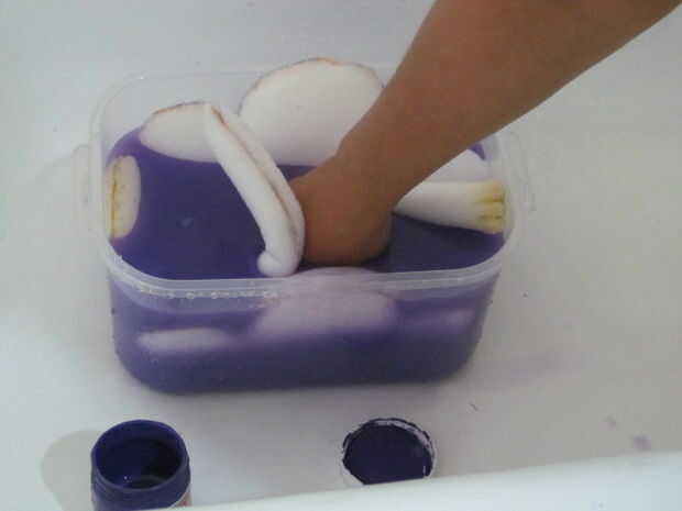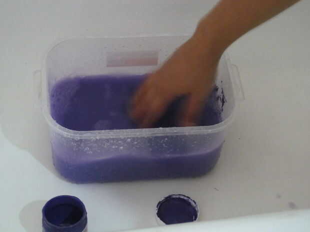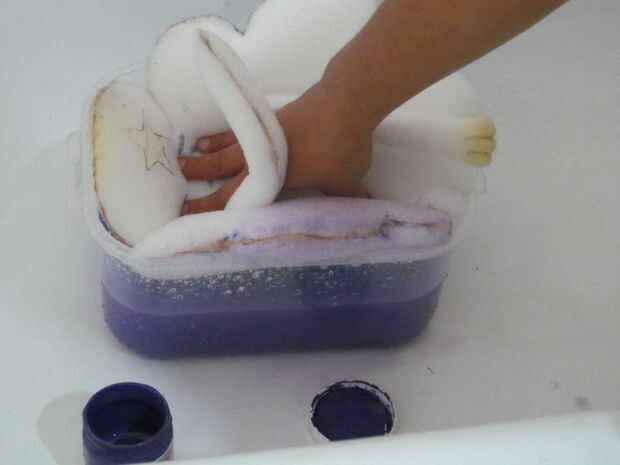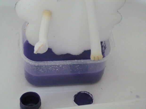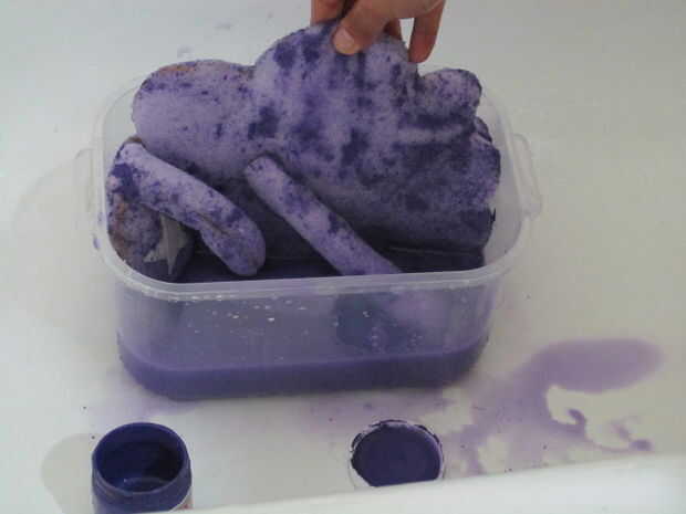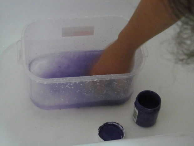 (en la primera foto: Traté de cubrir la superficie antes de que el baño de color, pero el agua púrpura se filtró también)