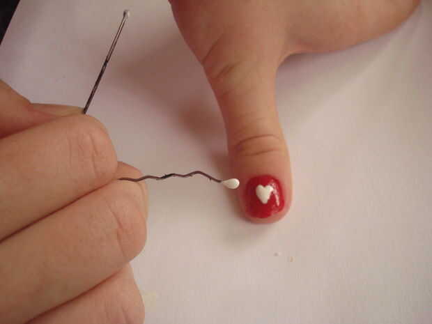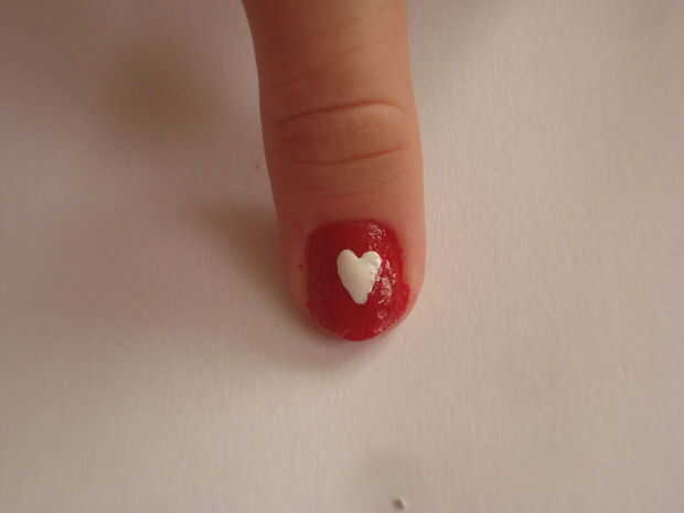 Usar la horquilla y sumergir en el blanco Polaco. En el pulgar Coloque dos gotas de polaco al lado de uno y use el alfiler o palillo de dientes y hasta hacer un corazón.