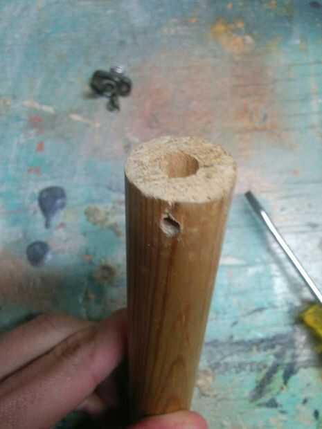 Taladre un agujero lo suficientemente ancho como para sostener la lente en uno de los extremos de la espiga.