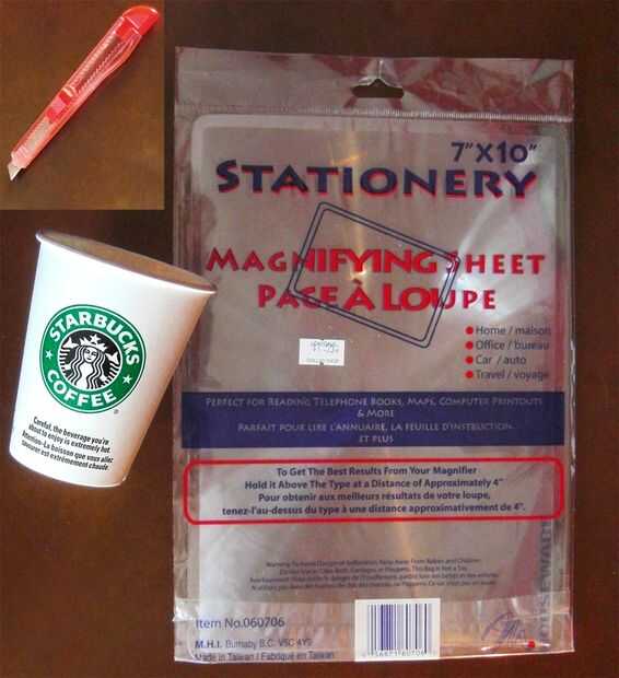 • hoja plástica de aumento (que se encuentra en el almacén del dólar)