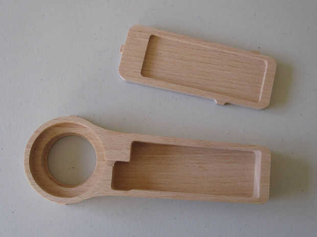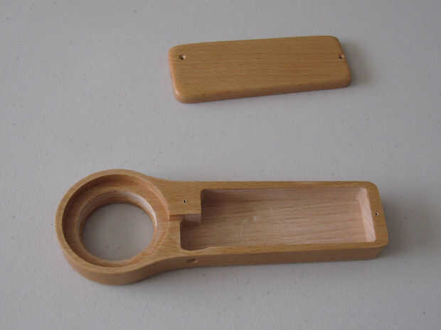 Después del corte, la arena de cualquier pestañas añadido durante el proceso de CAM. Probar el ajuste de la lente y de su aro. Si bien es demasiado apretado, un poco de arena interior. Luego lijar el borde superior de la caja y el borde inferior de la tapa de la batería para redondear en forma cómoda. También puede usar un router con una 1/8" redondo sobre pedacito, pero no lo encontré necesario. Hice la mayor parte de la forma con lija 150 y un bloque de lijado, conmutación a grano 220 al ponerme cerca de la forma que quería. También un poco redondo el interior superior borde del agujero donde usted va buscando a través de la lente.
