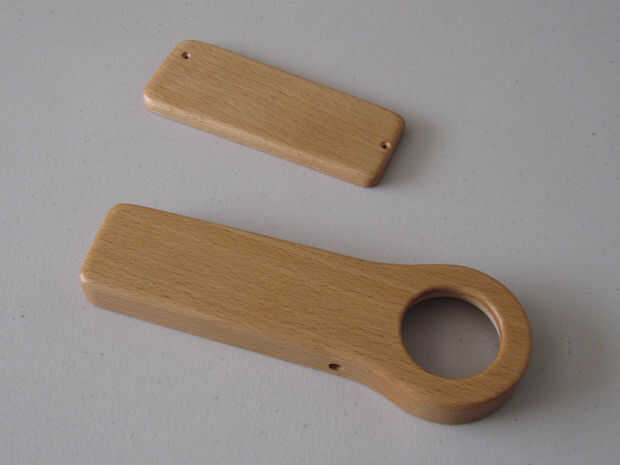 Taladre un agujero para el interruptor en el lado de la manija. Mi interruptor tuvo un agujero de 1/4 de pulgada, pero suya puede ser diferente. También necesita perforar agujeros para los tornillos que sostenga la tapa en su lugar. Comienzo por medir, marcar y taladrar los orificios en la tapa, con un 1/16 de pulgada broca. Se puede perforar desde el interior de la cubierta para facilitar las mediciones. Ahora Alinee la tapa con la parte superior del mango y sujételas firmemente con abrazaderas o unas vueltas de cinta adhesiva. Utilizando los agujeros en la tapa como guía, perfore orificios piloto de 1/2" profundamente en el mango. Separar las partes otra vez y agrandar los orificios en la cubierta 5/64". Por último, utilizar un 5/32" broca para avellanar los agujeros para las cabezas de los tornillos debajo de la superficie.