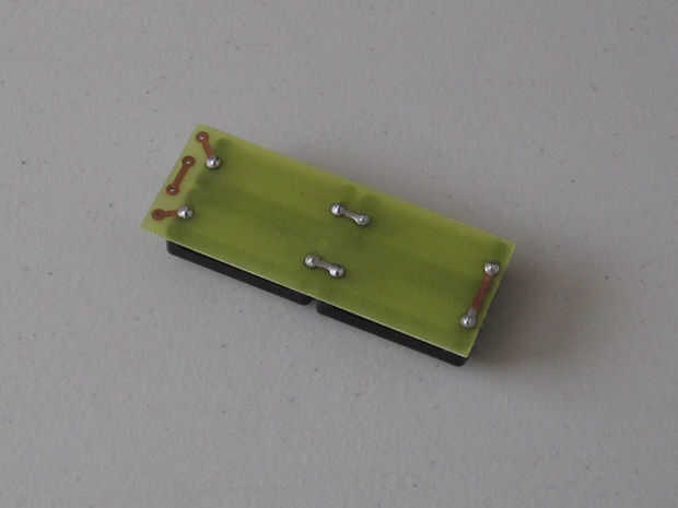 Yo esto bosquejan utilizando una antigua herramienta de PCB era de DOS. No he incluido el archivo porque ya no está disponible el software y el formato de archivo propietario. Sin embargo, el diseño es extremadamente simple. Esta Junta podría realizarse mediante la elaboración de los rastros con un rotulador; representación con una herramienta de CAD no es realmente necesario. Aquí está una imagen de los rastros de PCB como visto desde arriba o desde la parte inferior de la Junta... no tiene ninguna diferencia!
